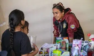 Photo of Riel Manywounds handing out prizes to rodeo participants