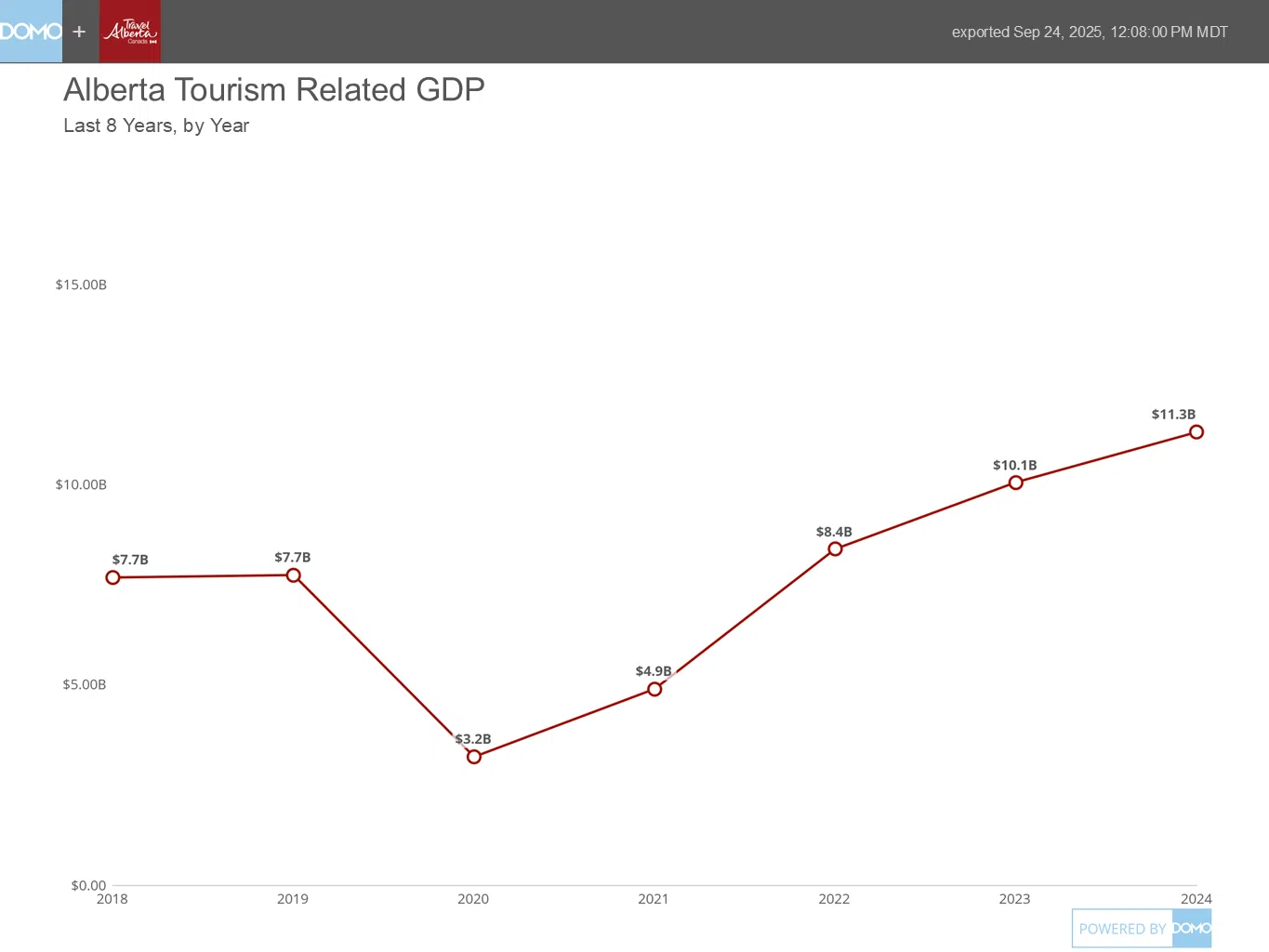 Tourism in Alberta makes up 17.5 per cent of the GDP, with 2024 seeing the industry contribute $11.3 billion to the economy, which has seen large growth since 2019 as tourism brought in $7.7 billion.